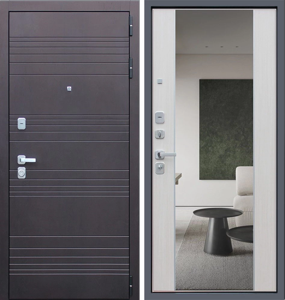 Надежная входная Дверь Дуэт с зеркалом премиум класса по цене 46 913 руб. Большая толщина стали защитит от проникновения в ваш дом, квартиру или коттедж. Используется очень качественная фурнитура: замки, цилиндры, ручки, защелки. Покрытие и отделка двери изготовлено под внимательным контролем производителя. Дверь имеет долгий срок службы и гарантию.